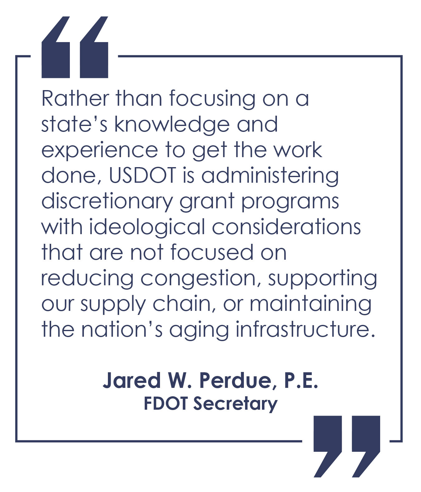 Florida continues to lead the charge amongst states in opposition to the new top-down funding structure IIJA has created, shifting away from traditional formula-based funding and toward a heavier reliance on an expanded discretionary grant program.